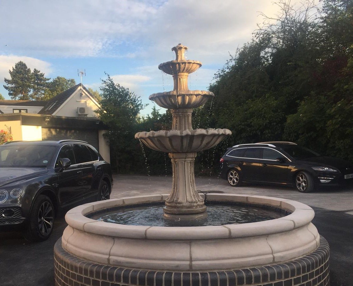 Our above ground 3 Tiered Barcelona Fountain, Large Cambridge Double Pool Surround.