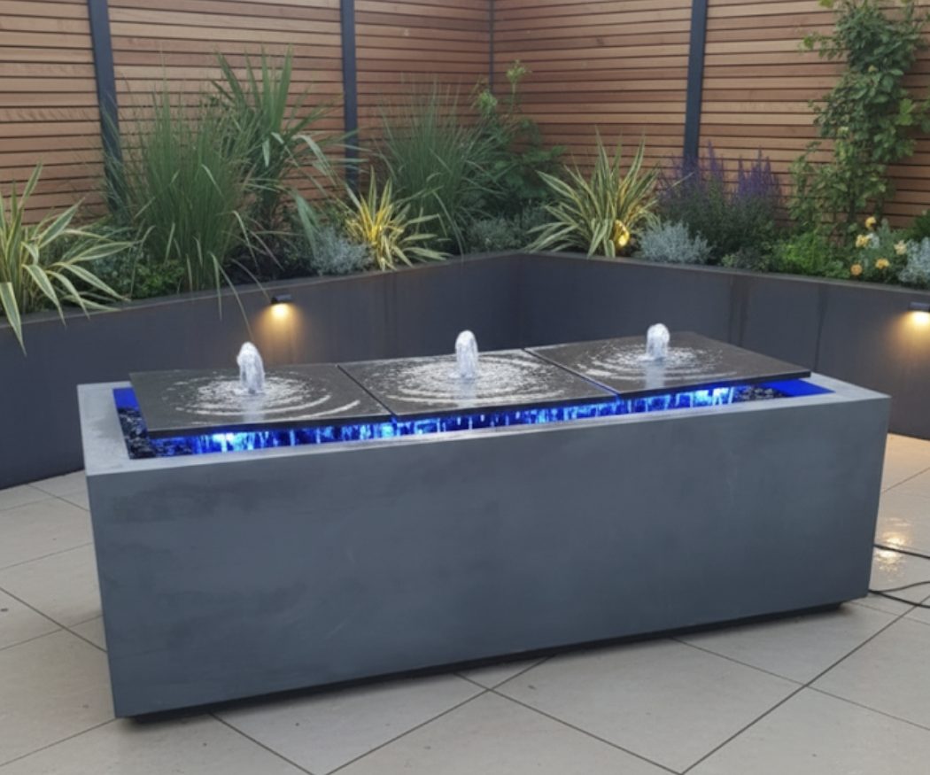 Pictured in our Battle ship grey colour, accompanied with 3 natural black slate plates, 3 pumps, and decrative stones.