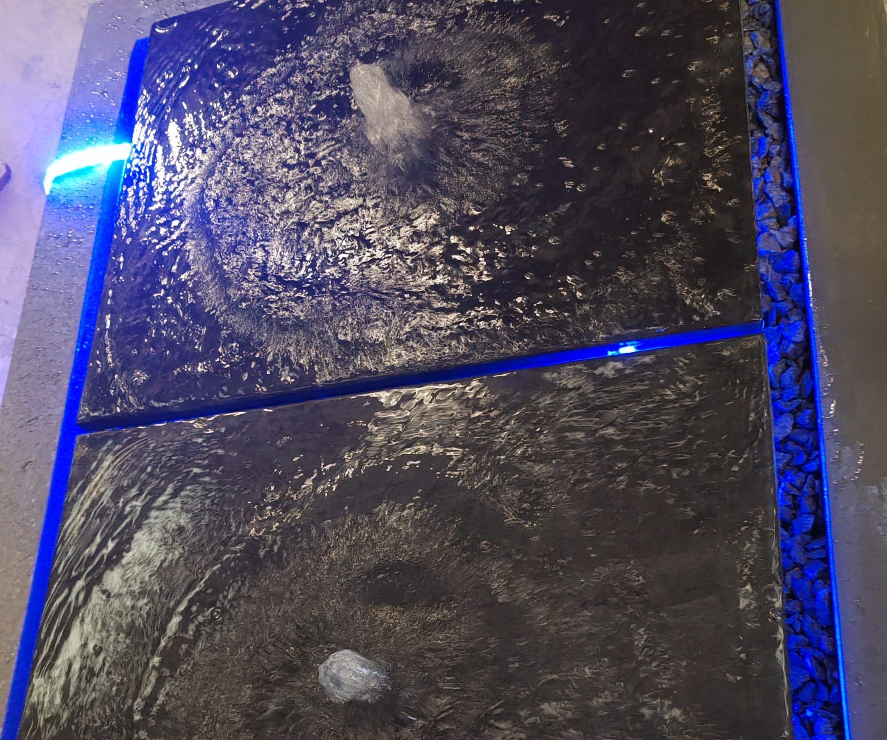 3 natural slate slabs from a quarry, that allow the water to cascade off of the edges to fall back into the bottom trough.