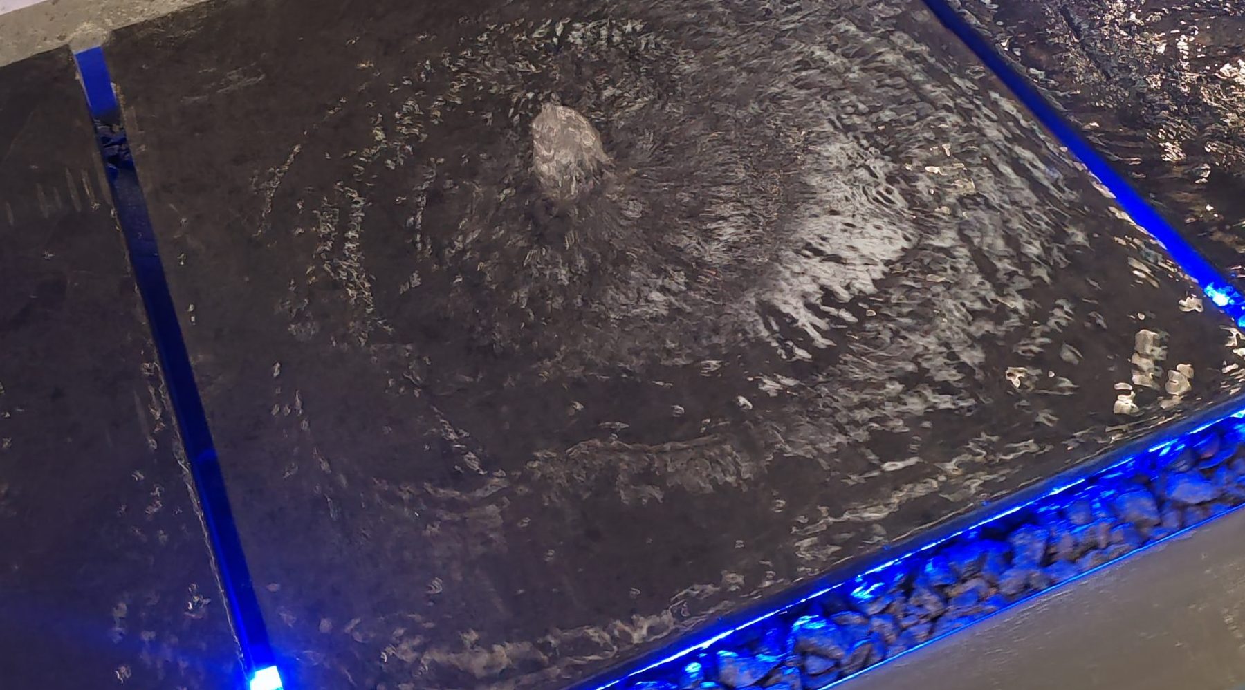 3 natural slate slabs from a quarry, that allow the water to cascade off of the edges to fall back into the bottom trough.