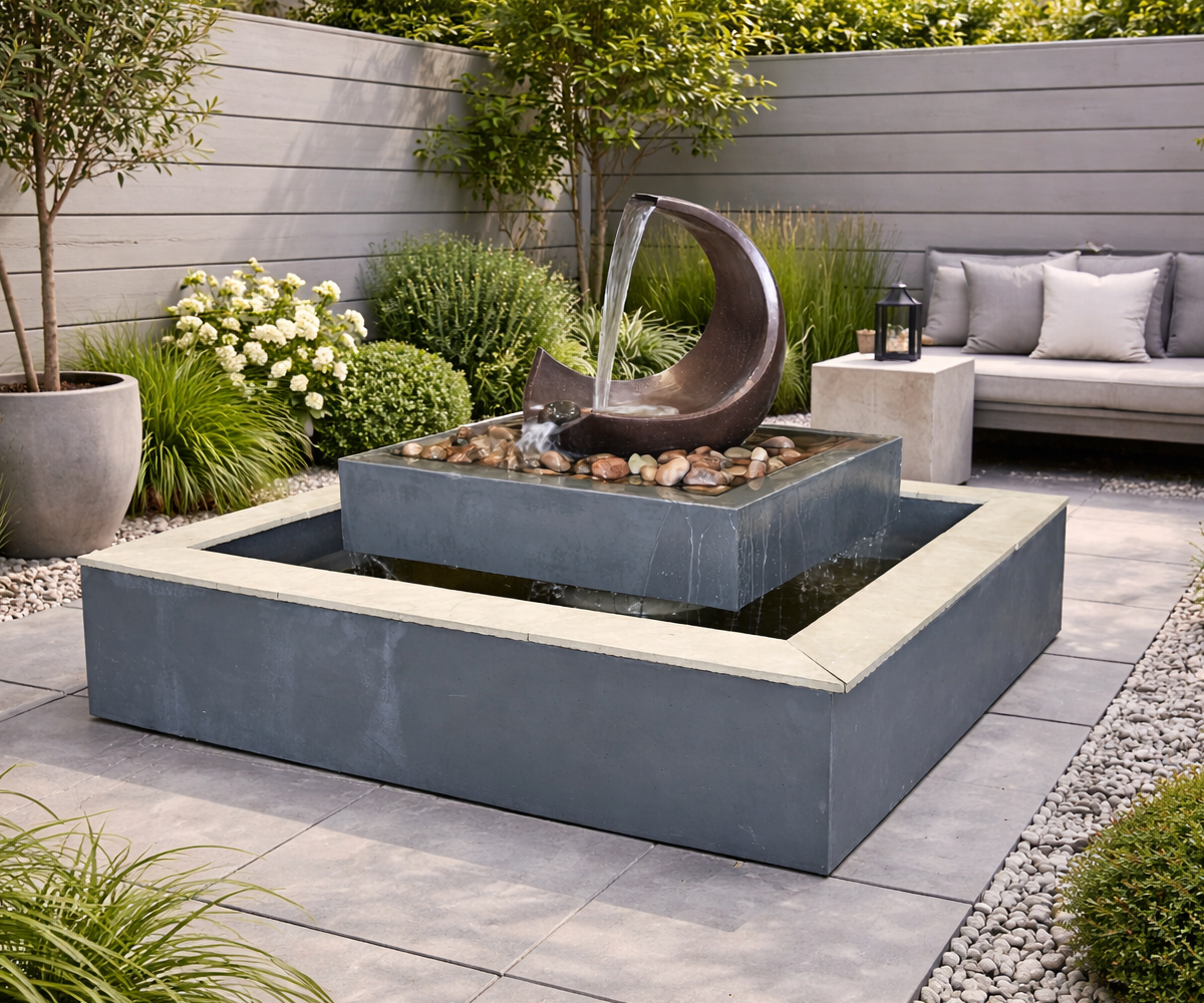 Geoff’s garden ornaments is please to offer our new design square Hayward pool with box Shard sculpture fountain , a striking focal point that combines the soothing sound of moving water, and as an optional add on of lighting, making it suitable for evening use and modern landscape designs.